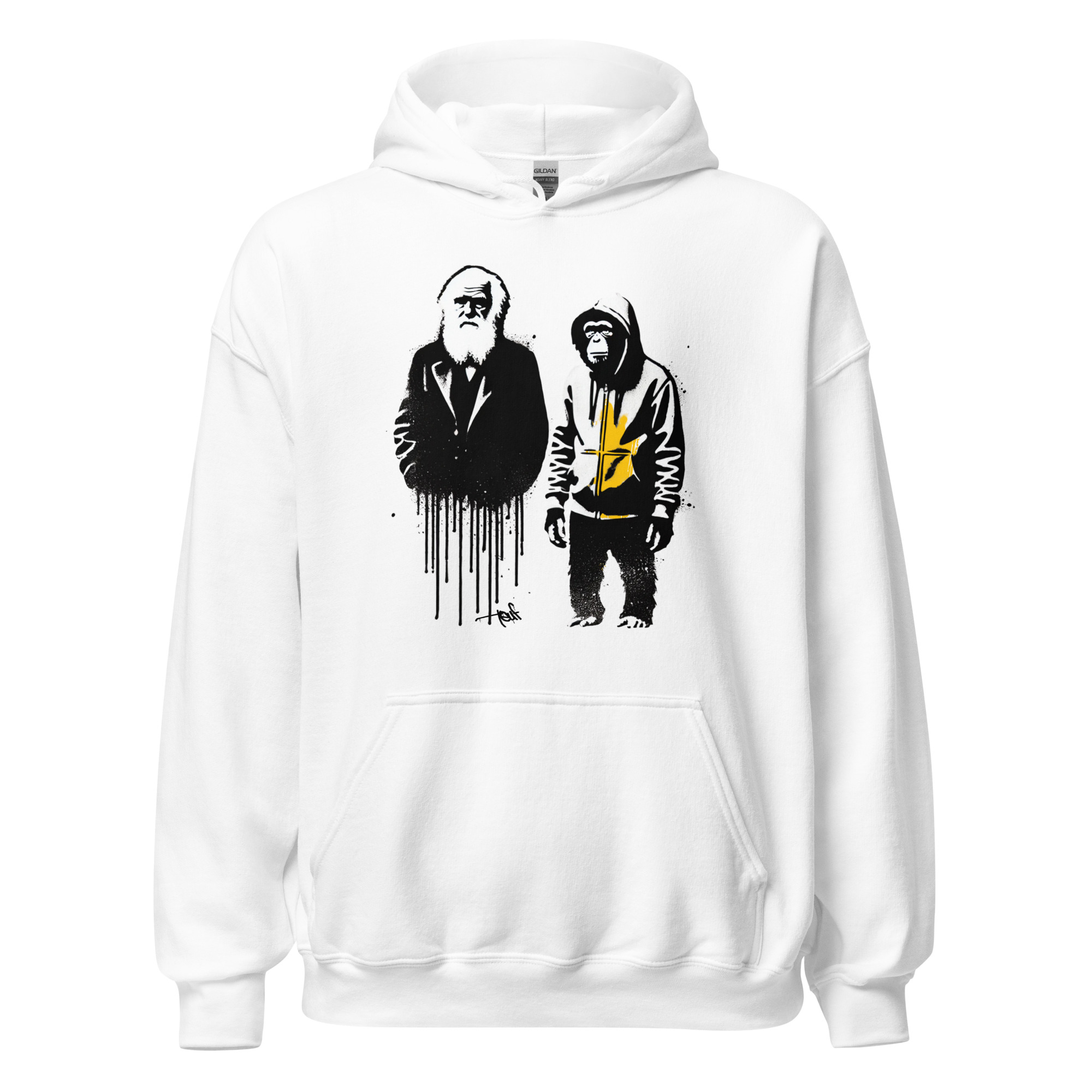 un singe en hoodie, symbole d’une humanité revenue à ses instincts.