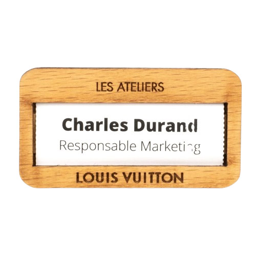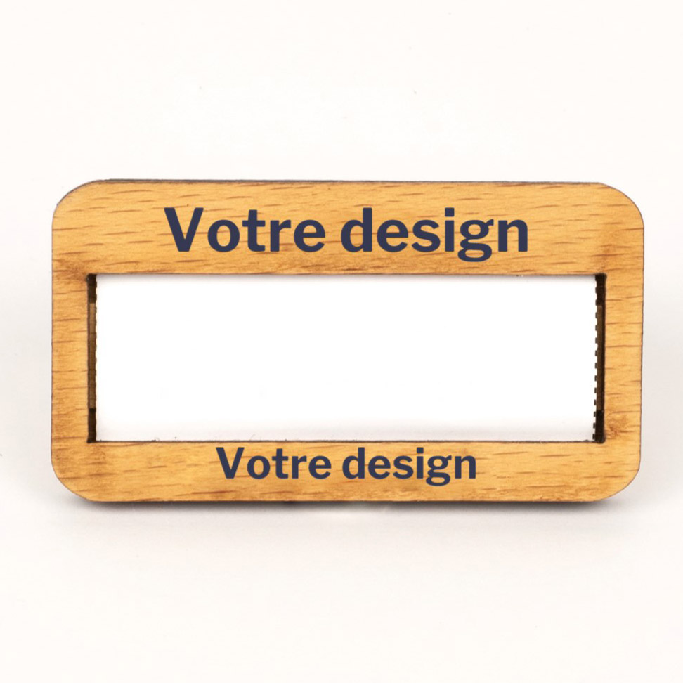 - Badge en bois (hêtre massif) permettant d’insérer une carte nominative (non fournie) de 54 x 22 mm.