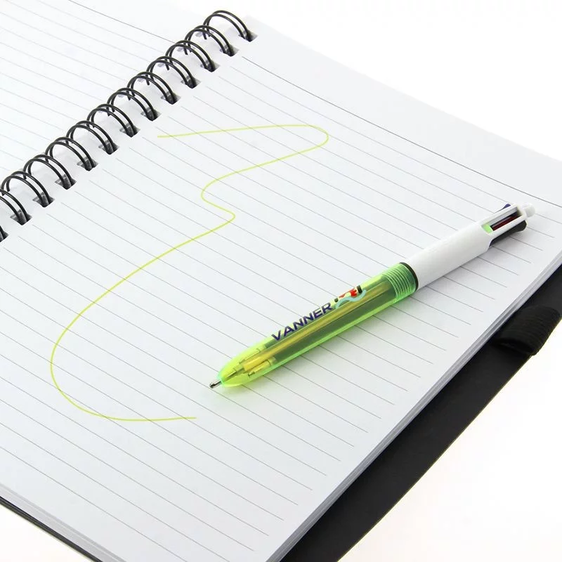 Ce stylo promotionnel est muni de 3 encres de couleurs standards (bleu, noir et rouge), combinées avec un surligneur fin d’une couleur jaune brillante.