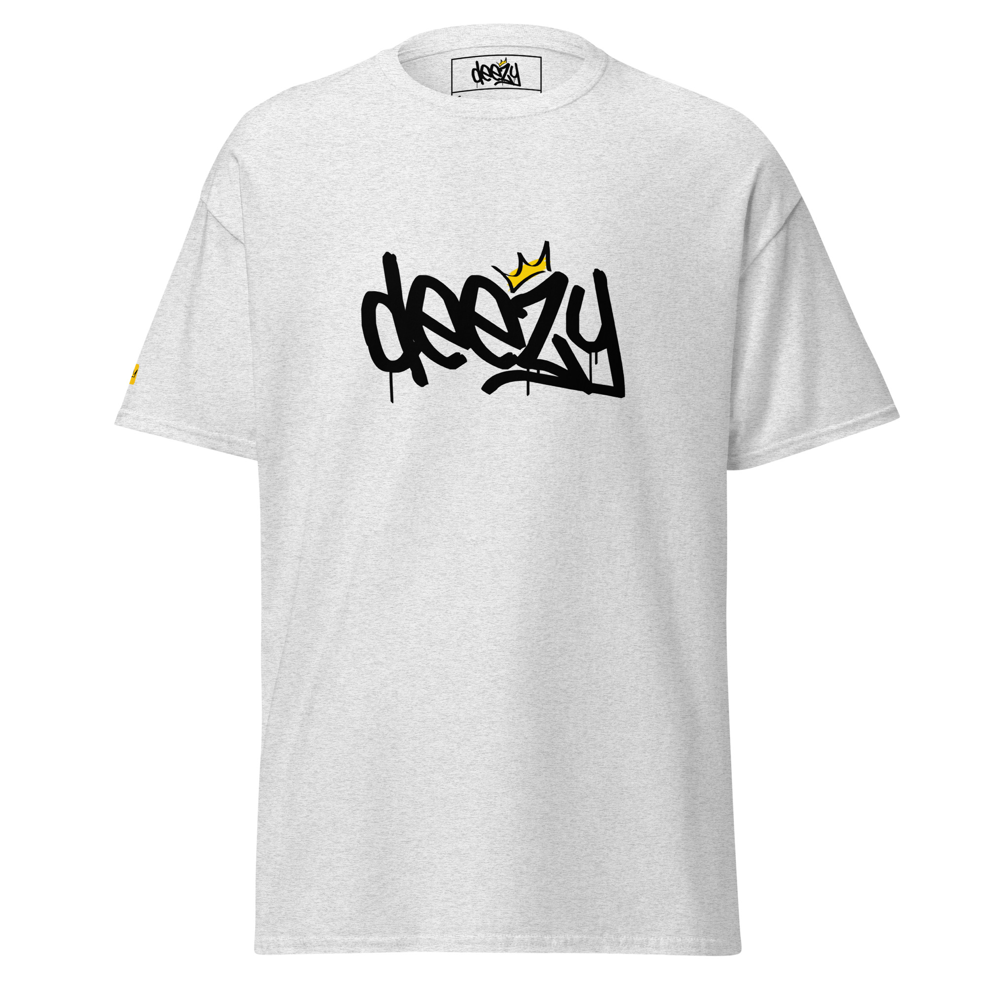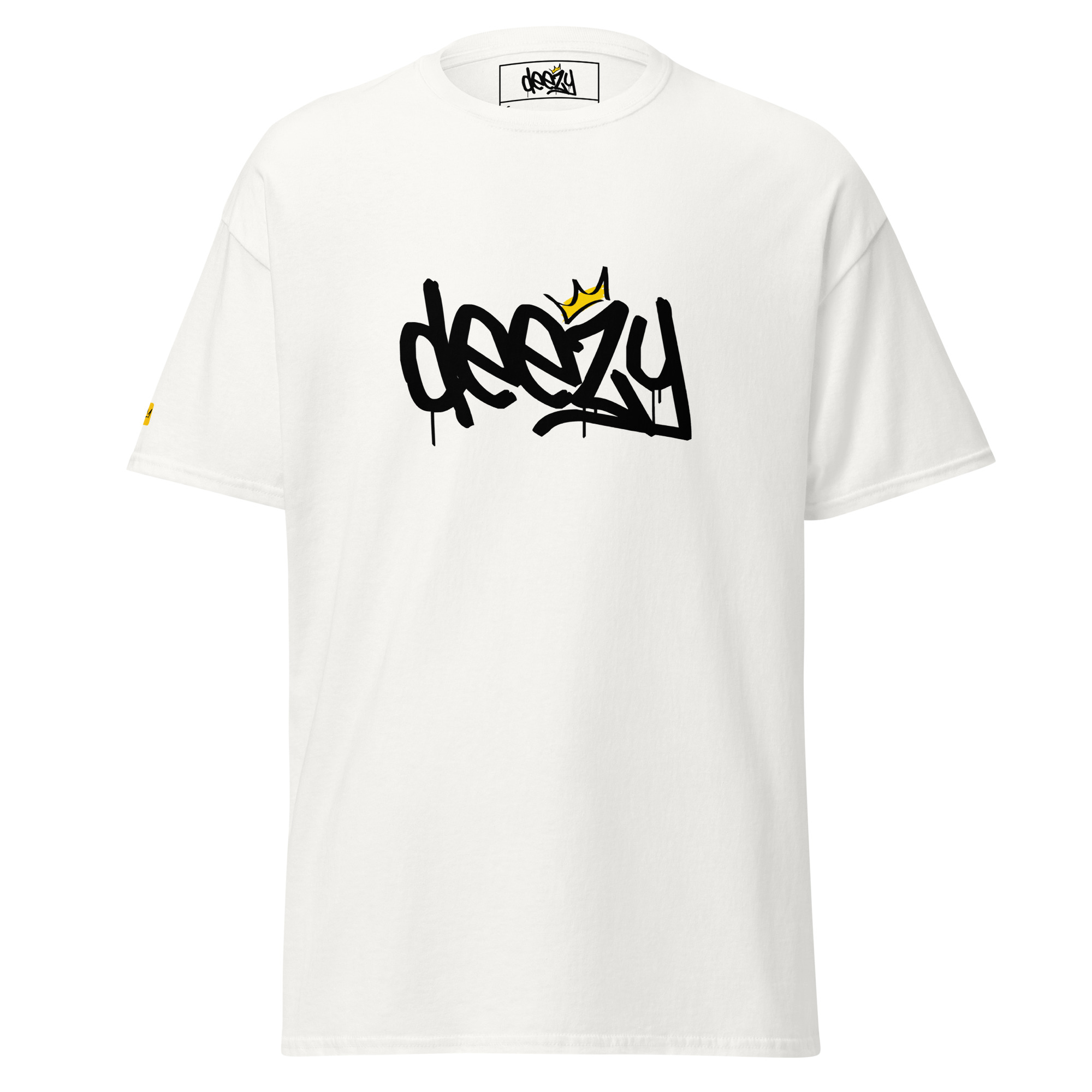 Le T-shirt qui dit tout, sans un mot de trop. Avec son logo graffiti « Deezy » imprimé en noir profond et couronne jaune, ce design est la pièce fondatrice de notre univers. Minimal à l’œil, maximal dans l’attitude. Une coupe unisexe confortable, un coton doux de qualité supérieure, et un clin d’œil subtile à l’avant-bras gauche : notre couronne iconique brodée en jaune.